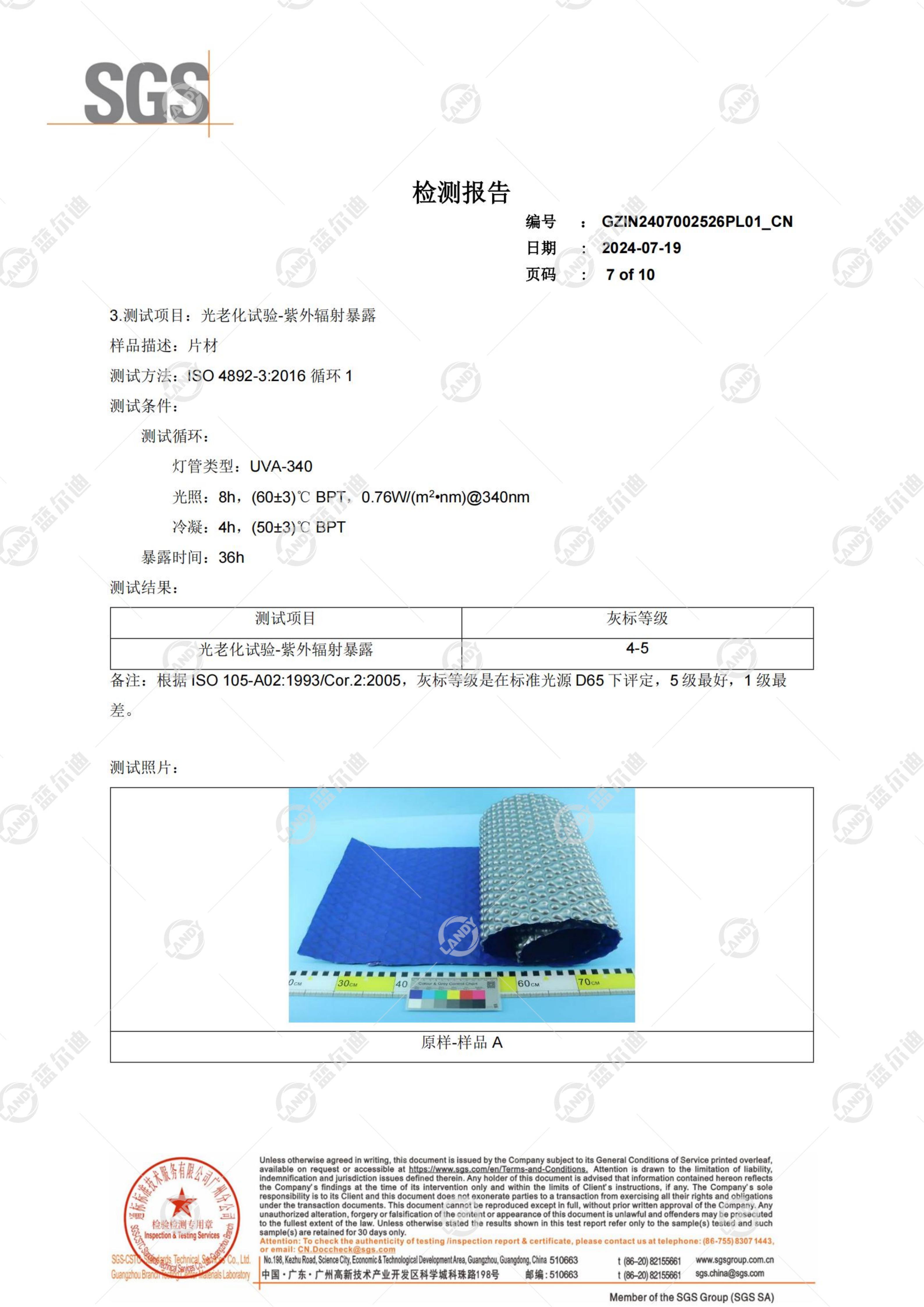 蓝尔迪集团旗下泳池气泡盖产品,在通标标准技术服务有限公司(SGS接受了全面而严格的测试,包括耐试剂性、温度循环、光老化试验(紫外辐射)、氯水色牢度及海水色牢度等多个项目,均取得了优异成绩,以可靠表现彰显了自身过硬的品质与值得信赖的性能。