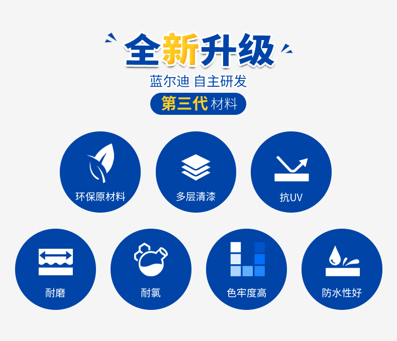 产品柔软、富有弹性;环保无毒,使用安全;图案逼真、色泽稳定;易安装、易维护、节约成本;良好的防水性能、防滑保护、耐氯、抗UV、耐侯性强、耐磨、防刮、抗撕裂等性能;抗菌无毒,使用寿命长。