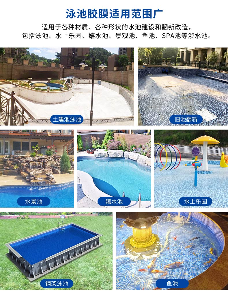 适用于酒店泳池、社区泳池 、私家泳池、水上乐园、温泉水疗、景观池、亲子泳池。适合各类基面泳池(包括瓷砖、马赛克、水泥和聚氨酯、钢结构等适用于室内、室外泳池),易于翻新改造。