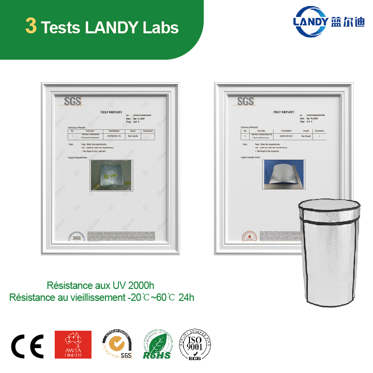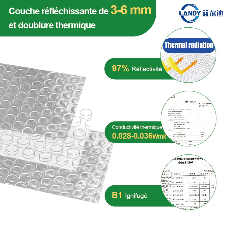 Isolation triple couche : Feuille d’aluminium + bulles d’air + feuille d’aluminium (épaisseur 3-6 mm), reflète 97 % des radiations thermiques (conductivité thermique 0,028–0,036 W/mK).