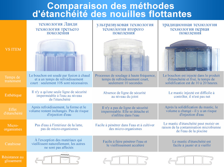 La surface de la bande flottante a la conception originale de texture concave et convexe antidérapante de bluedi; La tête de blocage adopte le processus de soudage par fusion à chaud, le temps de refroidissement est court, il ne faut que 10 s, il n'y a qu'une ligne étanche de sécurité au niveau du joint, propre et belle; Après refroidissement, le volume de forme est inchangé, il n'y a pas de risque d'entrée d'eau, pas d'humidité à l'intérieur de la bande flottante, pas de micro - organismes; Sauf le vieillissement naturel du matériau, d'autres n'ont aucun effet.