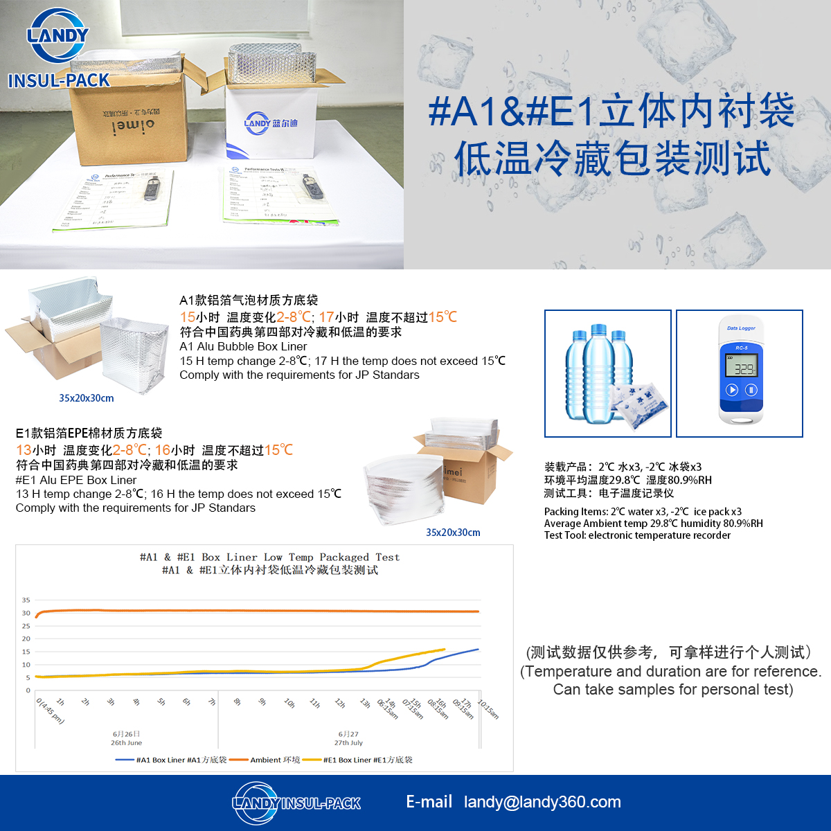 A1款铝箔气泡材质立体内衬袋 15小时 温度变化2-8°℃; 17小时 温度不超过15℃ 符合中国药典第四部对冷藏和低温的要求 E1款铝箔EPE棉材质立体内衬袋 13小时 温度变化2-8℃℃;16小时 温度不超过15℃ 符合中国药典第四部对冷藏和低温的要求 (测试数据仅供参考,可拿样进行个人测试)