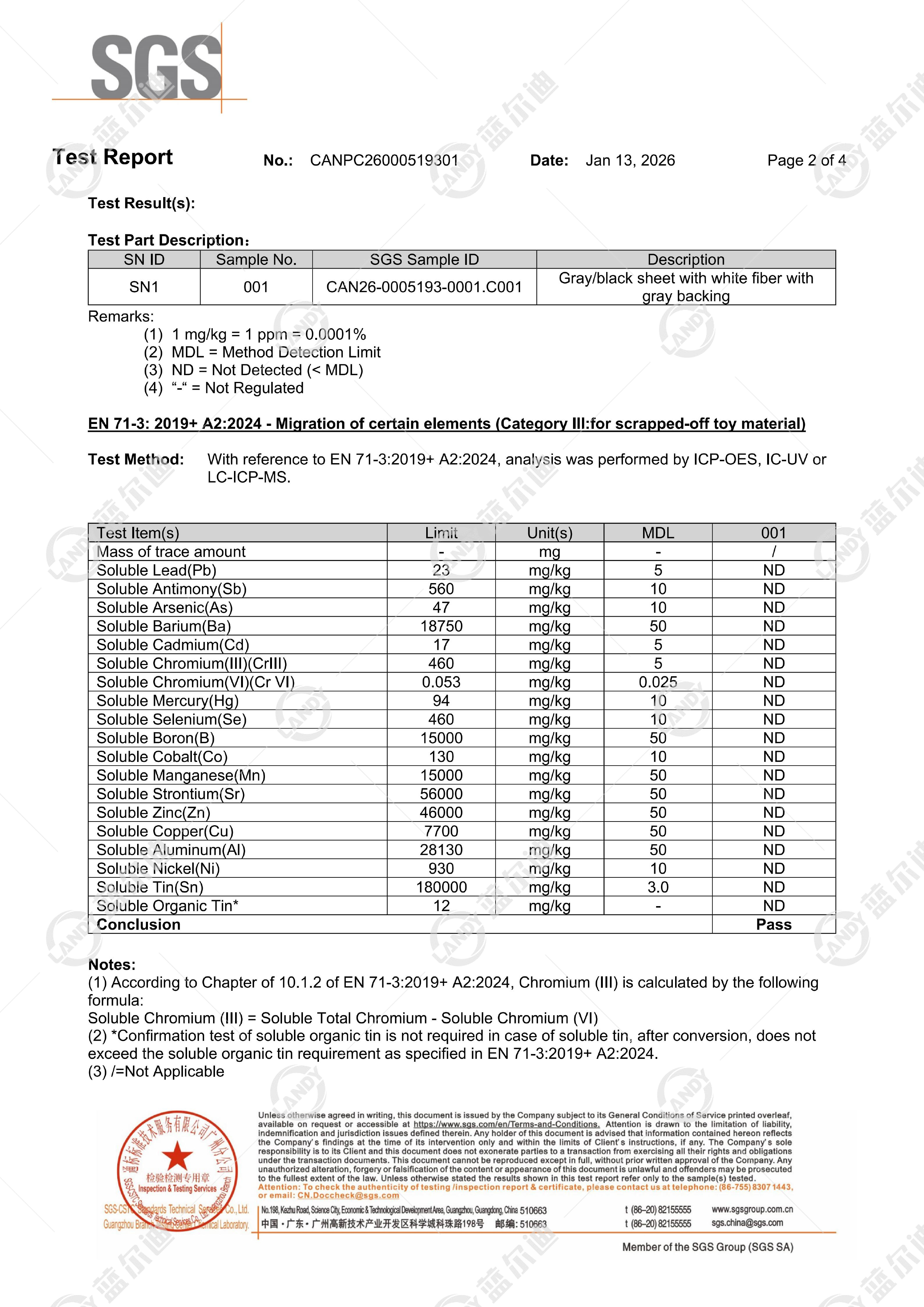 Nedavno osnovnoy produkt gruppy kompaniy Landy — PVKH-plenka dlya basseynov — uspeshno proshla strogiye ispytaniya SGS, vsemirno priznannoy organizatsii po testirovaniyu. Protokol ispytaniy № CANPC26000519302 podtverzhdayet polnoye sootvetstviye produkta yevropeyskomu standartu bezopasnosti igrushek EN71-3:2019+A2:2024, bez obnaruzheniya migratsii 19 klyuchevykh vrednykh elementov, chto yavlyayetsya avtoritetnoy garantiyey bezopasnogo primeneniya v detskikh basseynakh.