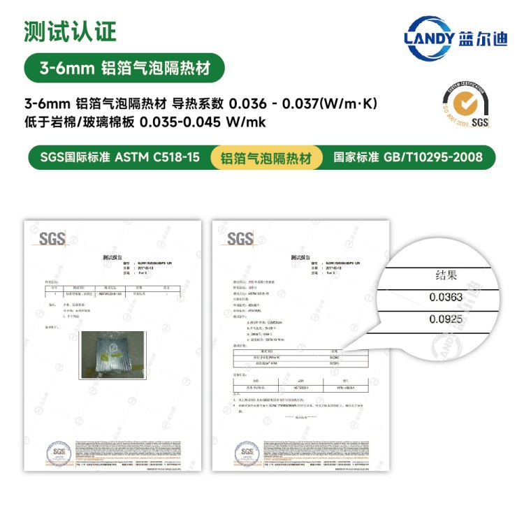 蓝尔迪厚度 3mm 的铝箔隔热材料在导热系数测试中,严格遵循 ASTM C518 标准,运用稳态热流计法进行检测,在 23℃环境温度、50% 相对湿度条件下,导热系数实测值低至 0.032W/m・K,有效保障了保温效果的稳定性。