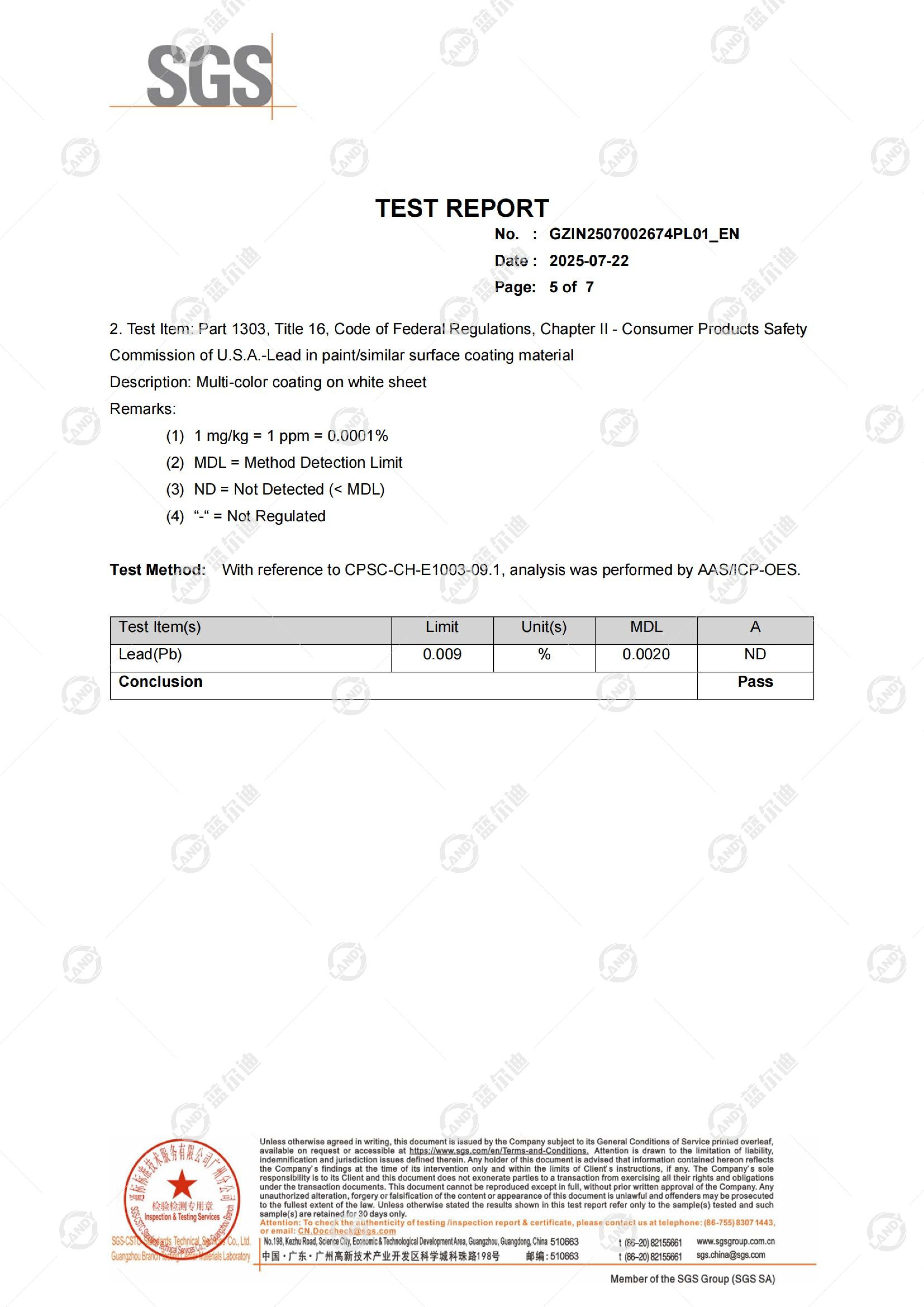 2. 表面涂层铅含量检测:参照美国消费者产品安全委员会(CPSC)16 CFR Part 1303标准,采用CPSC-CH-E1003-09.1方法(AAS/CP-OES分析)检测胶膜表面多彩涂层的铅含量。结果显示铅含量未检出(ND),远低于0.009% 的限值要求,从源头杜绝铅污染风险,保障用户使用安全。