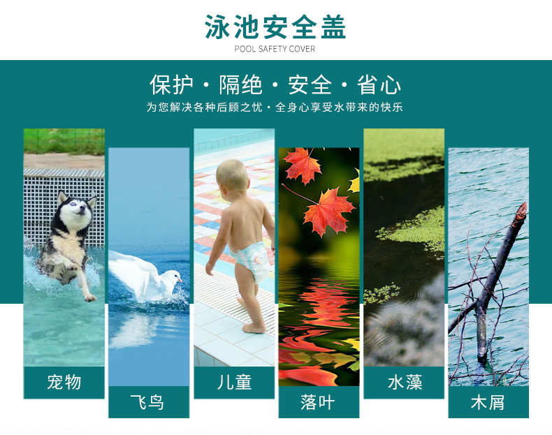 3、安全:抗紫外线,坚固耐用,超强承重 200kgs,保障生命安全,防止小孩和宠物掉入水池;