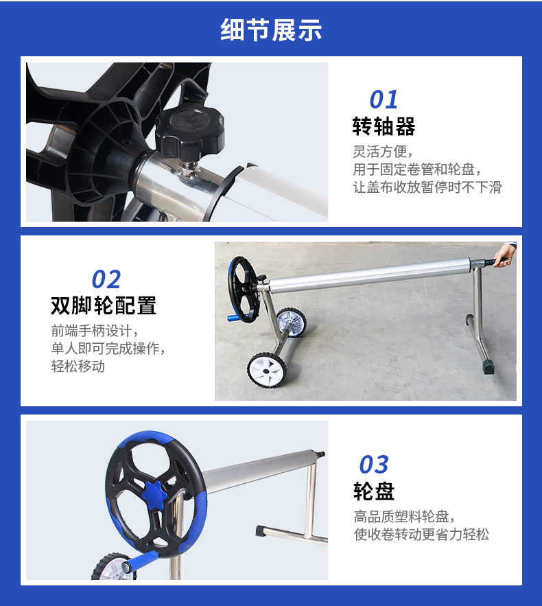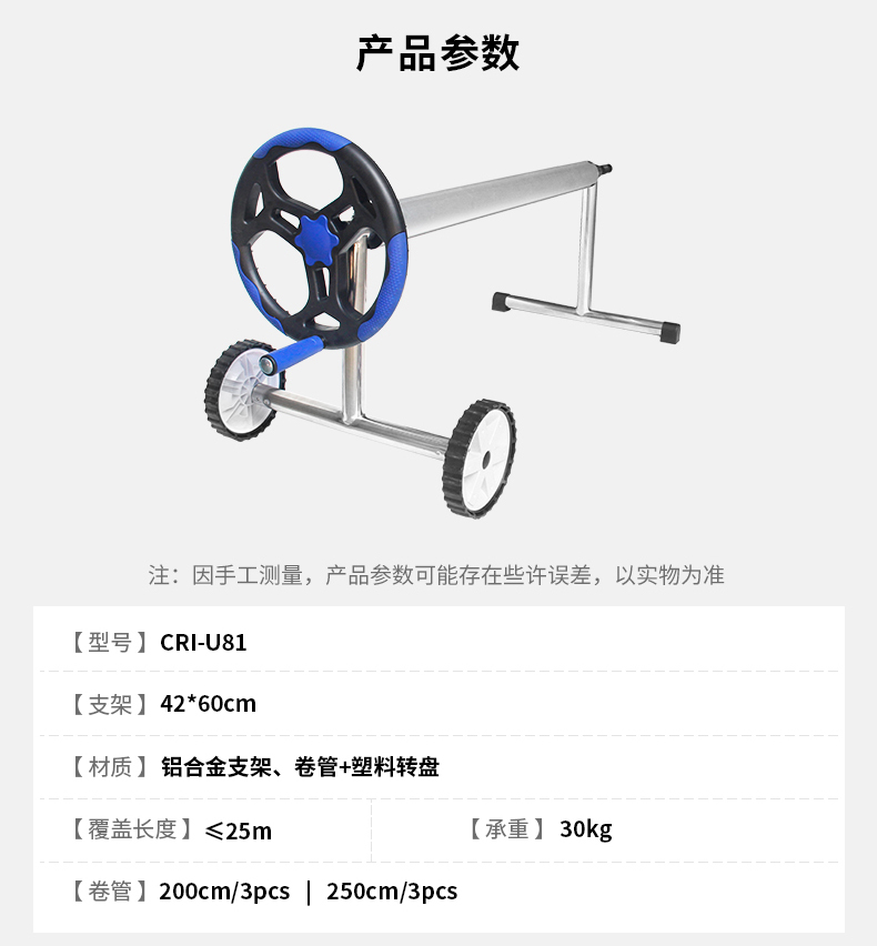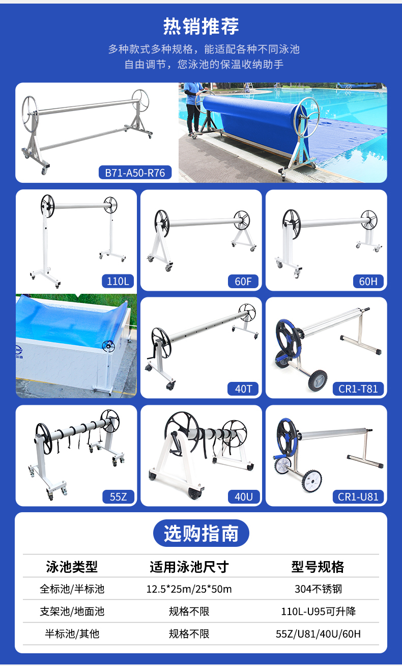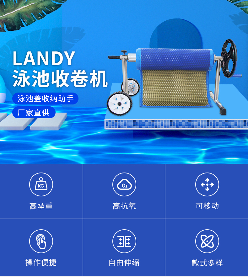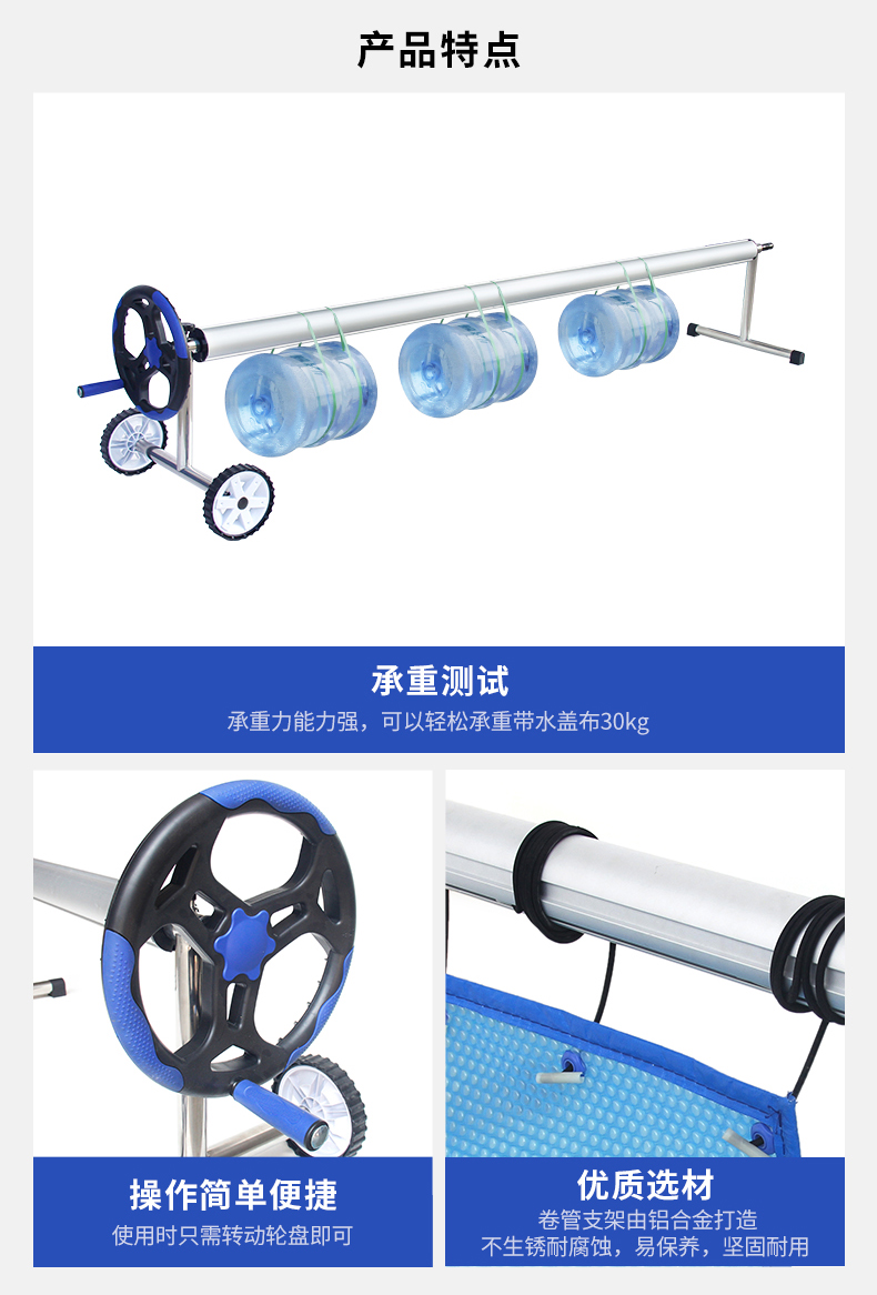 应用场景:配合泳池保温盖布使用,用于多种水池环境的保温防尘,如酒店泳池、社区泳池、赛事泳池、学校泳池、体育馆泳池、私家泳池、温泉水疗、亲子泳池等。