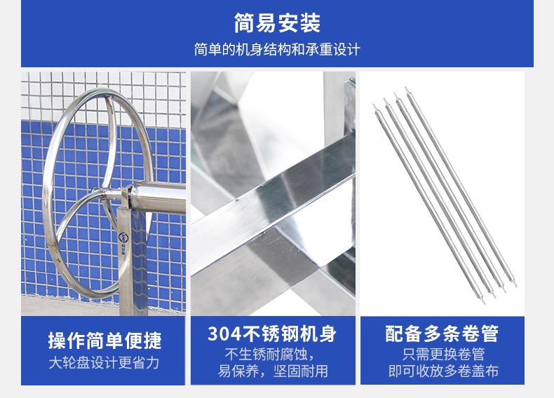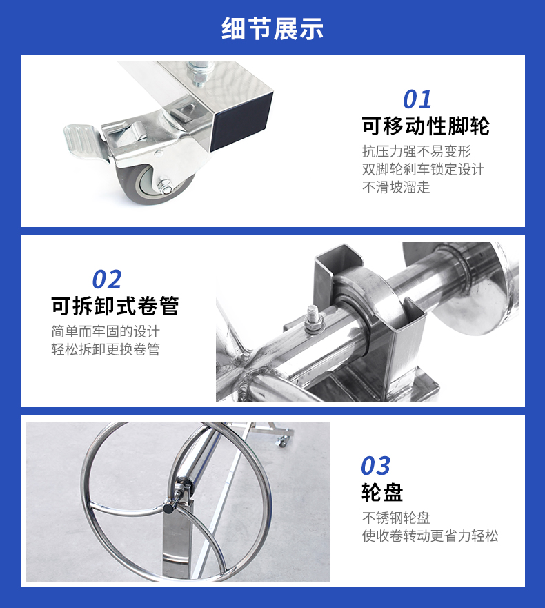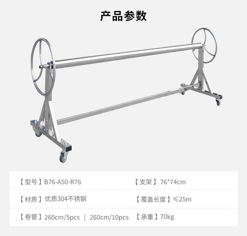 坚固耐用,承重力优异 /带脚轮,可灵活移动/ 易拆装 / 一台收卷机可搭配多根卷管 /卷管容易拆装,可收放多卷盖布 / 使用操作便捷/不生锈、耐腐蚀