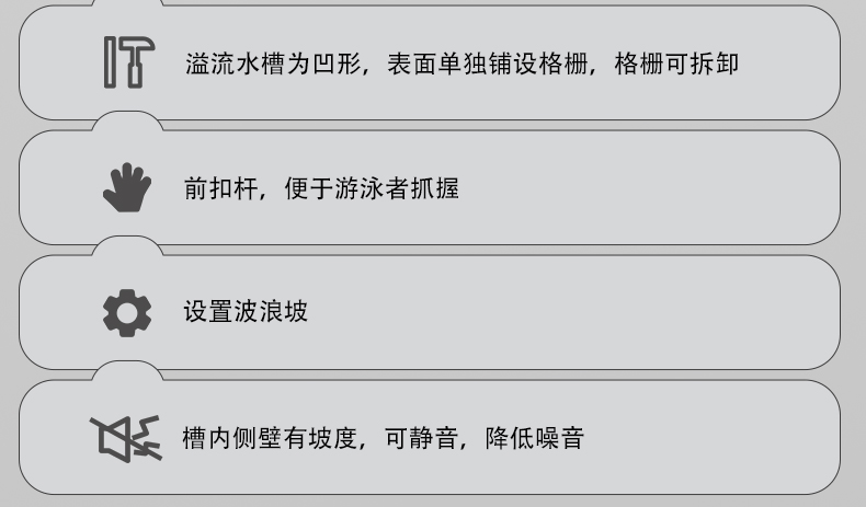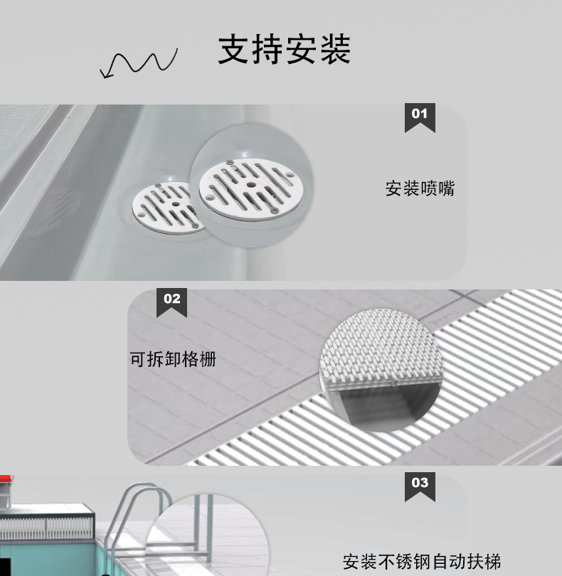 适用于酒店泳池、社区泳池 、私家泳池、水上乐园、温泉水疗、景观池、亲子泳池等场景,满足不同的排水需求。