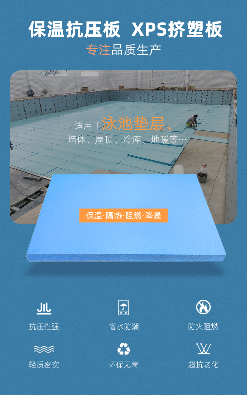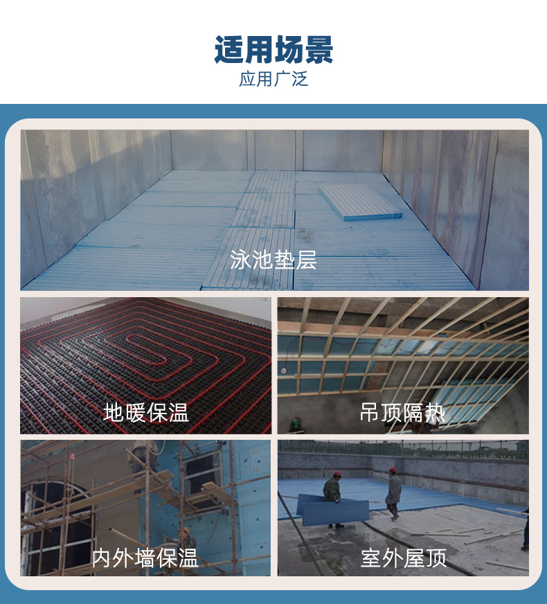 适用于酒店泳池、社区泳池 、私家泳池、水上乐园、温泉水疗等水池的垫层,及地暖、内外墙、室外屋顶隔热等。
