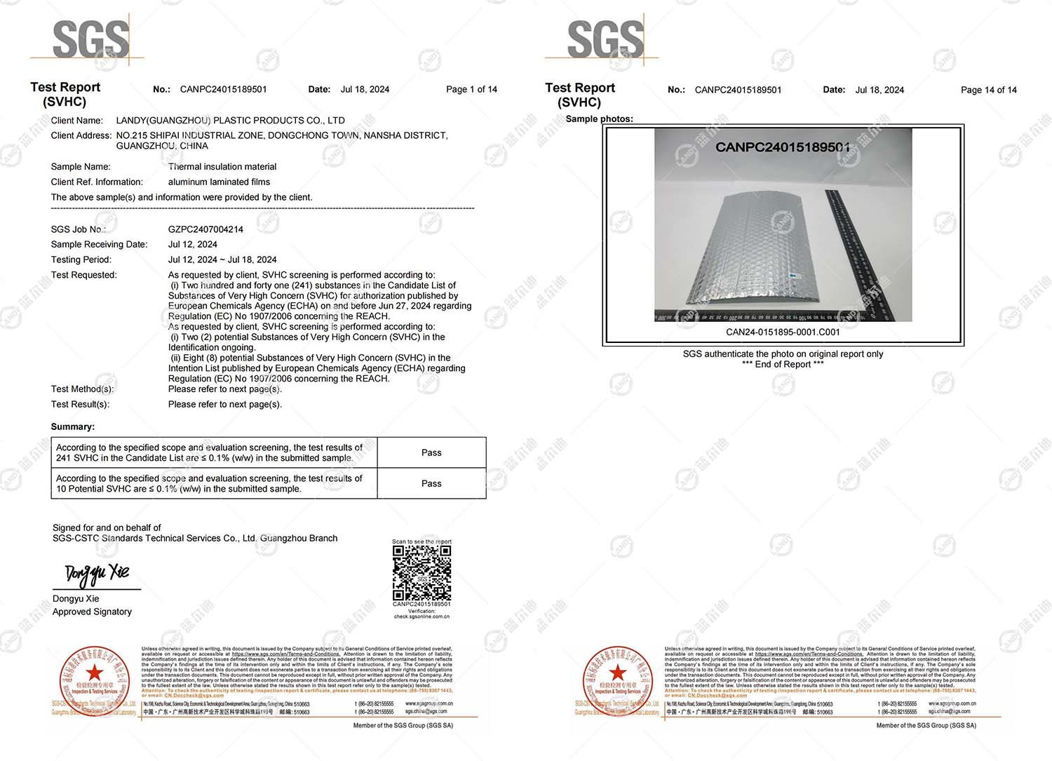 Guangzhou Landy Company commissioned SGS, an international authoritative testing institution, to conduct a comprehensive test on the substances of very high concern (SVHC) in its aluminized bubble insulation material (including PE bubble film and aluminized film) in accordance with the REACH regulations. The report shows that both products passed the screening tests for 241 substances on the SVHC candidate list and 10 potential SVHCs. The concentrations of all substances are lower than the regulatory limit of 0.1% (w/w), meeting the strict requirements of the EU REACH Regulation (EC No. 1907/2006). This result reflects Landy's precise control over the production process and the environmental safety performance of its materials.