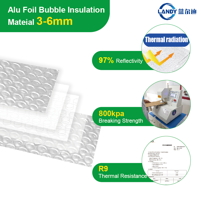 3-Layer Insulation: Alu Foil + Bubbles + Alu Foil (3-6mm thickness) reflects 97% of heat radiation (0.028–0.036 W/mK thermal conductivity).