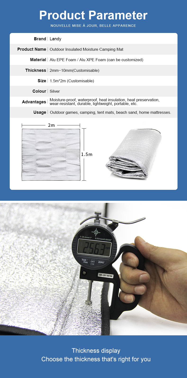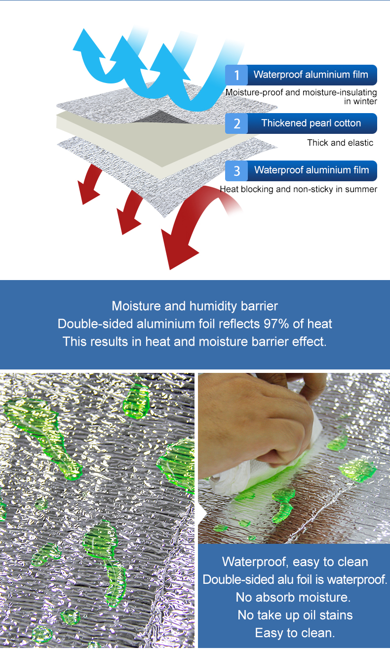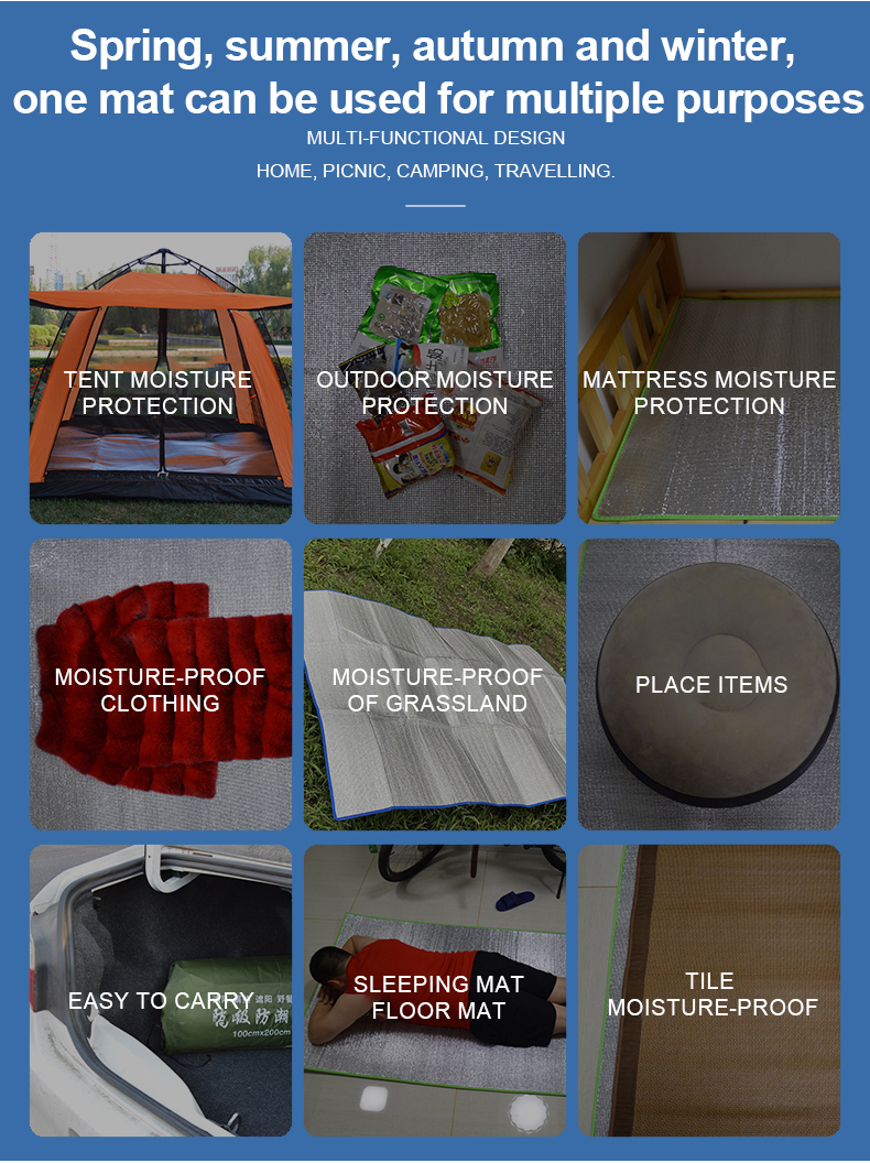 Advantages: moisture-proof, waterproof, heat insulation, heat preservation, wear-resistant, durable, lightweight, portable, etc. Uses: outdoor play, wild camping, tent floor mat, beach sand, home mattresses
