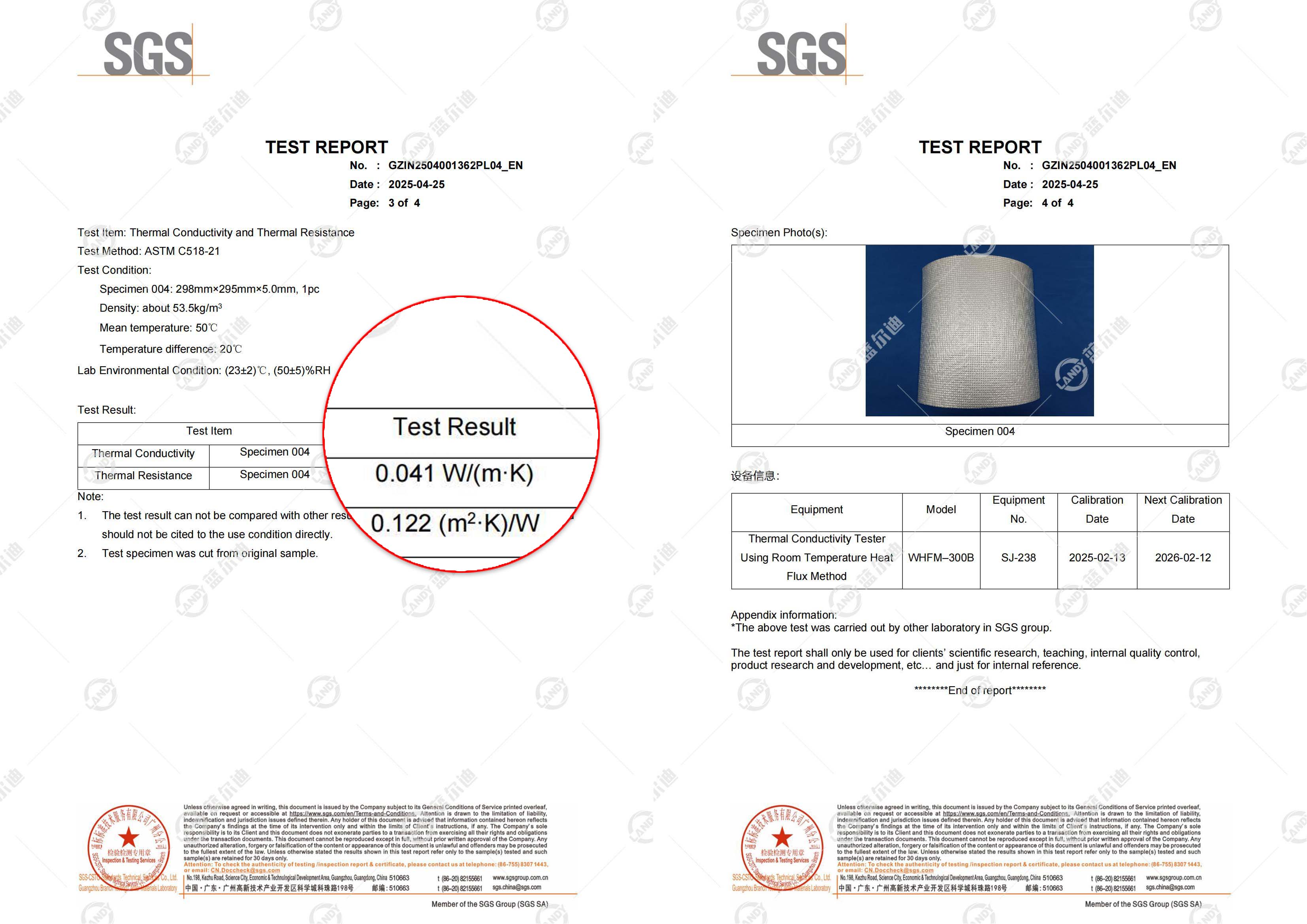 · Les résultats montrent qu'il existe une relation linéaire entre l'épaisseur et la résistance thermique, ce qui peut guider la sélection de l'épaisseur dans la conception technique. Les densités de 53,5 kg/m³ (5 mm) et 43,6 kg/m³ (10 mm) mettent en valeur l'efficacité légère et répondent aux besoins d'isolation thermique à faible densité.