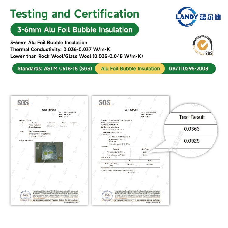 L'isolation thermique en feuille d'aluminium de 3 mm d'épaisseur de Landy a été testée pour la conductivité thermique en stricte conformité avec les normes ASTM C518 en utilisant la méthode du débitmètre thermique à état constant. Dans les conditions de température ambiante de 23 ℃ et d'humidité relative de 50%, la valeur de conductivité thermique mesurée est aussi faible que 0,032W / m ・ K, assurant efficacement la stabilité des performances d'isolation thermique.