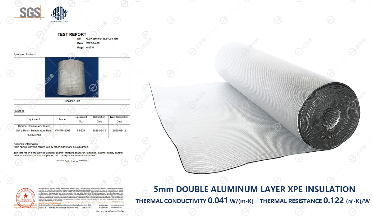 Récemment, le matériau d'isolation composite Landy Pure Aluminium + XPE + Pure Aluminium de 5 mm d'épaisseur de Guangzhou Landy Plastic Products Co., Ltd. a réussi l'essai SGS ASTM C518-21 (No d'essai: GZIN2504001362PL04_CN). Conduit strictement conformément à la norme ASTM C518-21 dans un environnement expérimental contrôlé avec précision, l'essai a montré qu'à une température moyenne de 50 ° C et une différence de température de 20 ° C, le matériau a une conductivité thermique aussi faible que 0,041 W / (m) ・ K) et une résistance thermique de 0,122 (m²) ・ K)/W, démontrant une excellente capacité d'isolation thermique.