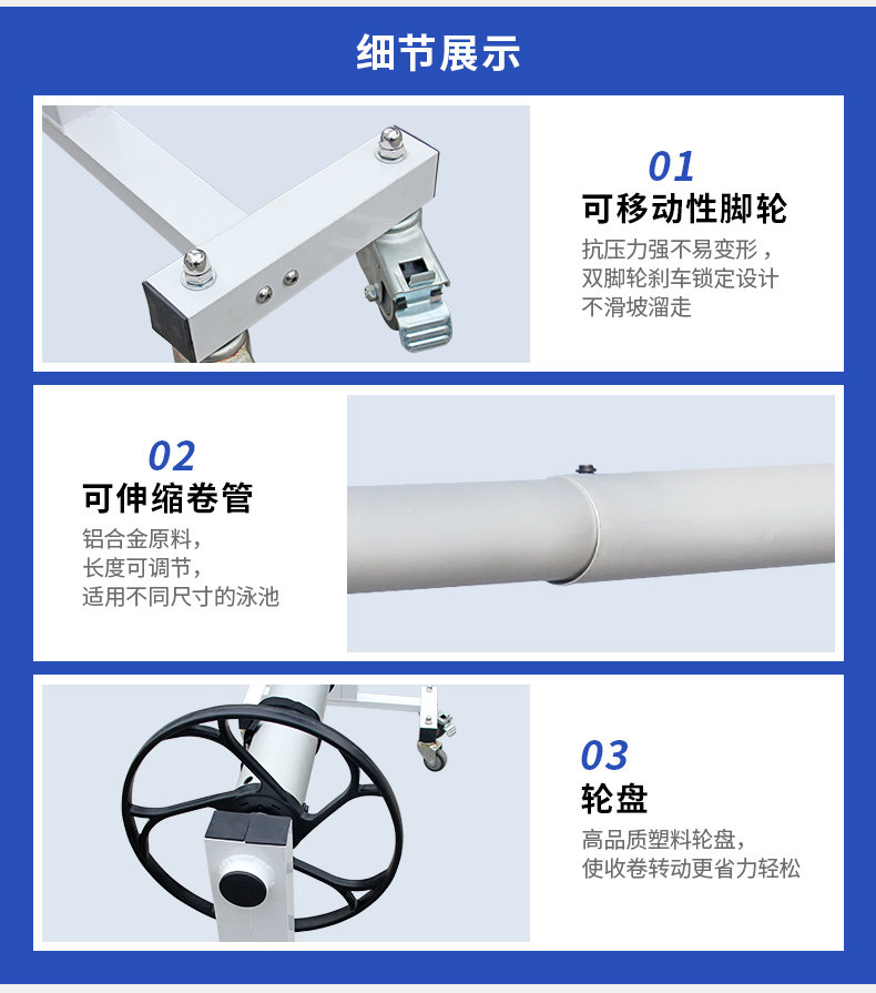 产品特点:承重力好 / 带脚轮,可灵活移动 / 易拆装 / 使用操作便捷 / 可根据泳池大小自由伸缩 / 抗氧涂层,不生锈不受烈日或低温影响