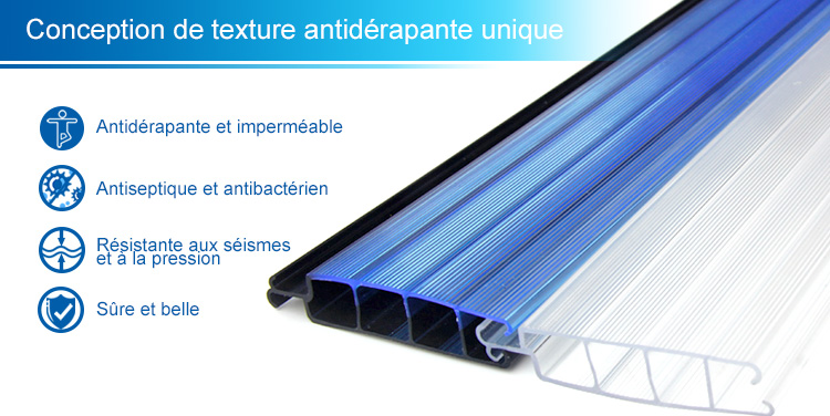 La surface de la bande flottante a la conception originale de texture concave et convexe antidérapante de bluedi; La tête de blocage adopte le processus de soudage par fusion à chaud, le temps de refroidissement est court, il ne faut que 10 s, il n'y a qu'une ligne étanche de sécurité au niveau du joint, propre et belle; Après refroidissement, le volume de forme est inchangé, il n'y a pas de risque d'entrée d'eau, pas d'humidité à l'intérieur de la bande flottante, pas de micro - organismes; Sauf le vieillissement naturel du matériau, d'autres n'ont aucun effet.