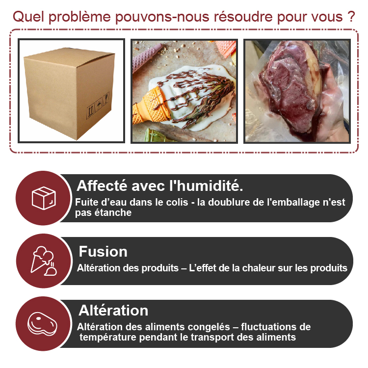 Utilisation: transport de produits sensibles à la température, tels que la viande congelée, les fruits de mer, les desserts, les fruits et légumes