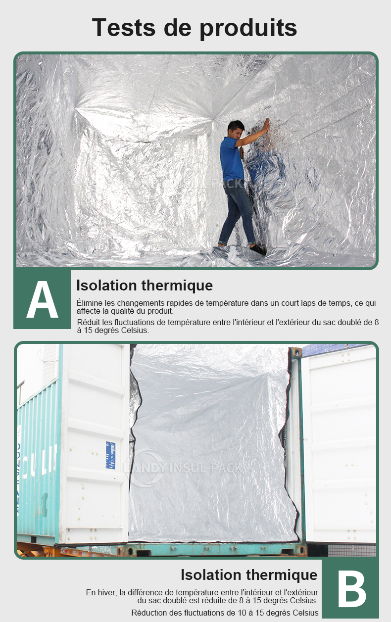 A. isolation thermique: éliminer les changements brusques de température dans un court délai affectant la qualité du produit, les fluctuations de la différence de température entre l’intérieur et l’extérieur du sac à doublure peuvent réduire 8-15 degrés celsius