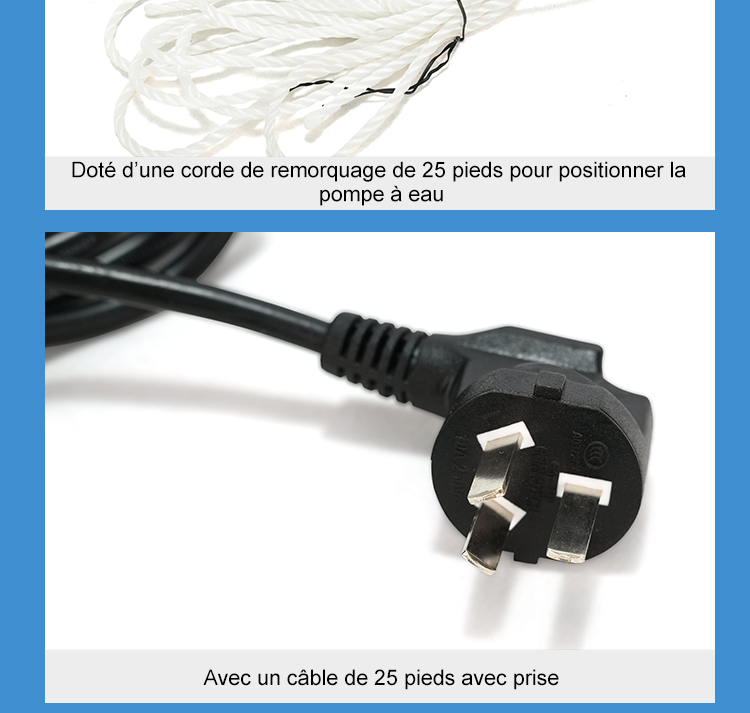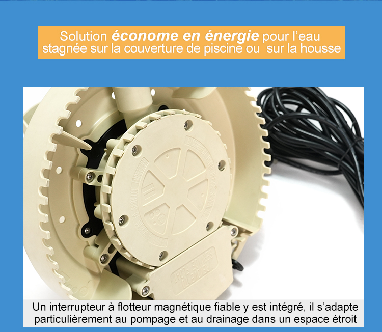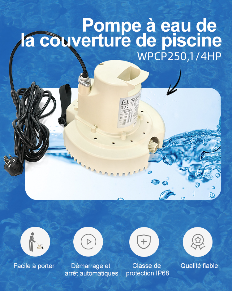 L’eau est retirée de la couverture de la piscine pour la garder au sec, ce qui prolonge la durée de vie de la couverture de la piscine et garantit qu’elle ne sera pas déformée ou endommagée par un excès d’humidité pendant l’utilisation. En outre, la pompe de couverture de piscine peut aider à réduire l’évaporation dans la piscine et à économiser l’eau.
