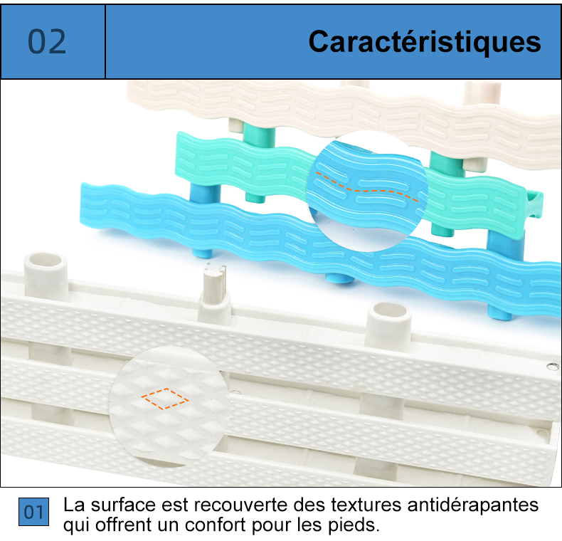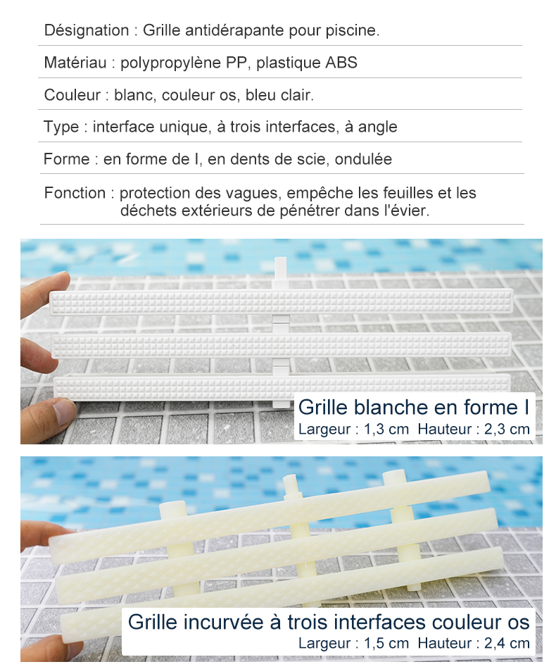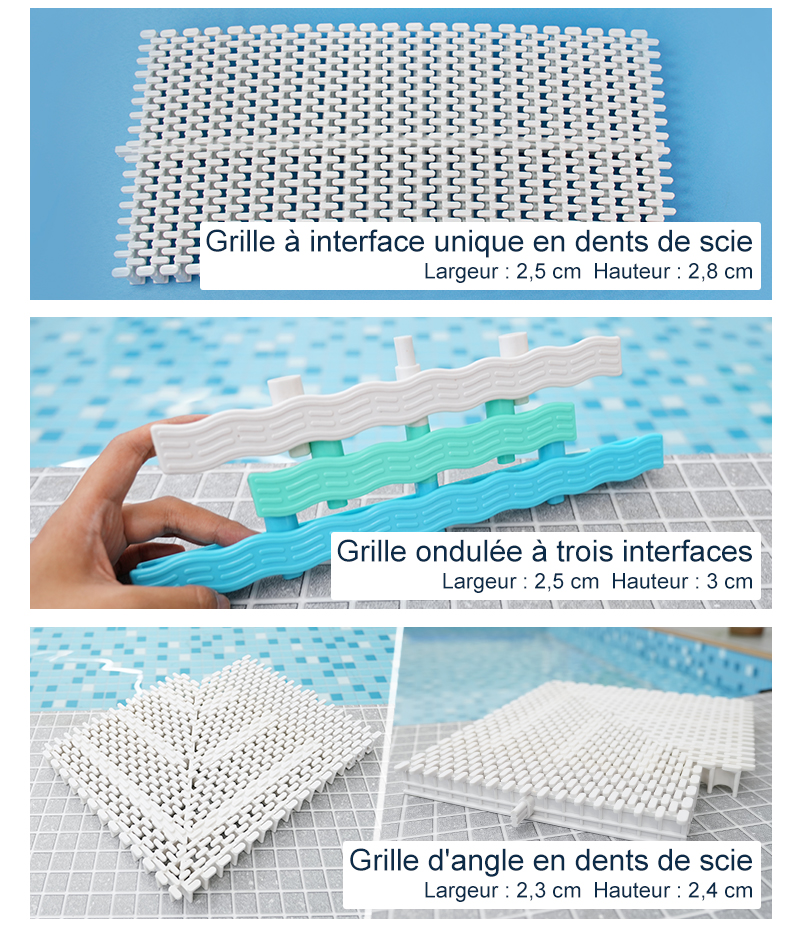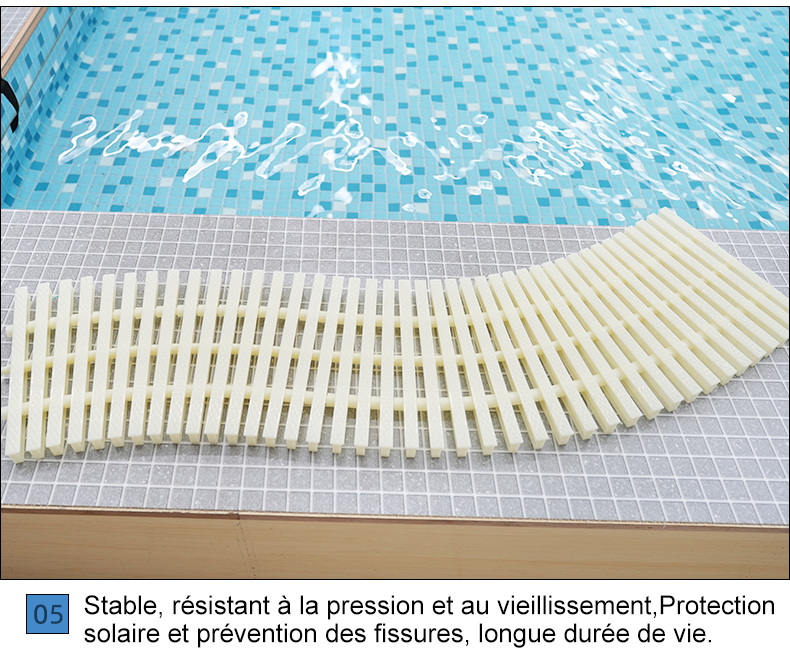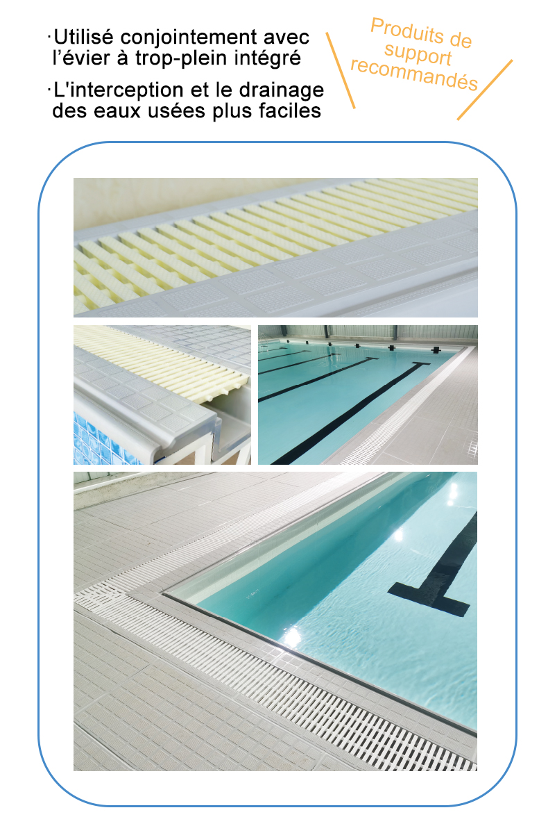 Utilisé au bord de la piscine, agit comme un drainage et antidérapant, tout en facilitant l’accès des baigneurs à la piscine et en garantissant la sécurité.