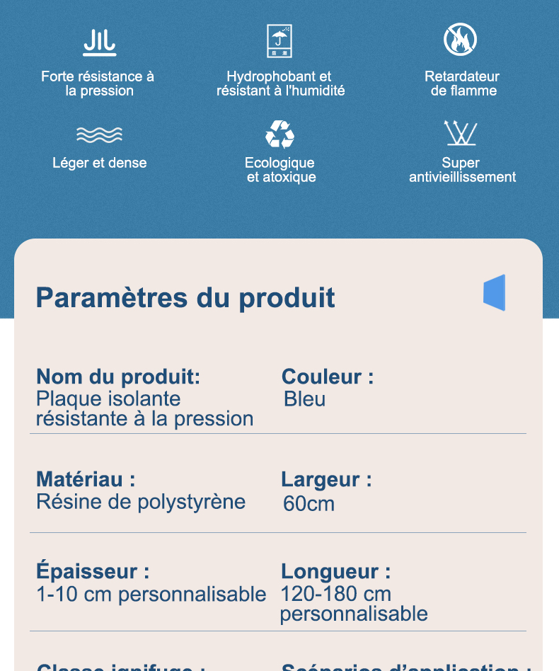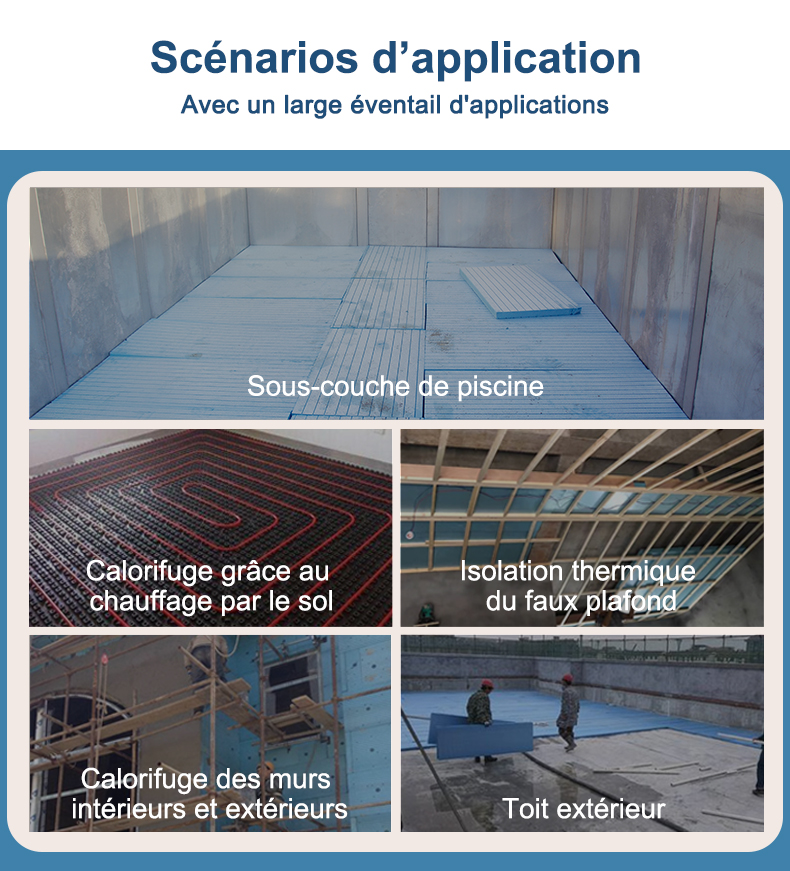 Idéal pour le revêtement de piscines d’hôtel, piscines communautaires, piscines privées, parcs aquatiques, spas et autres piscines, ainsi que pour le chauffage au sol, l’isolation des murs intérieurs et extérieurs, les toits extérieurs, etc.