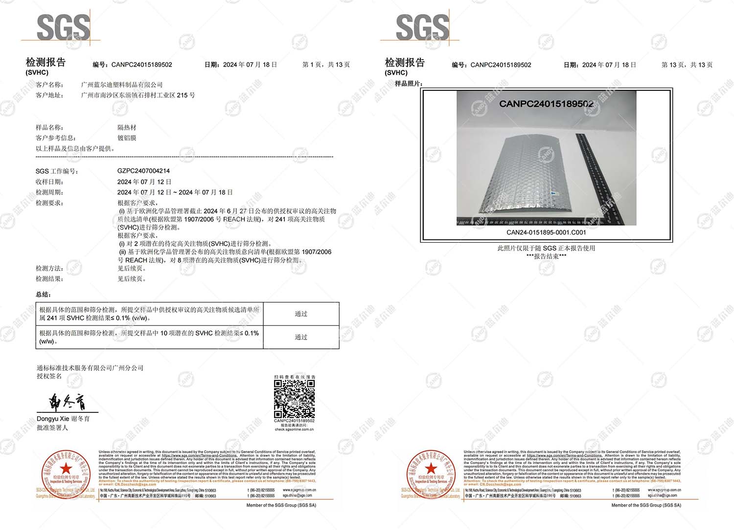 广州蓝尔迪公司委托国际权威检测机构 SGS,对其铝箔气泡隔热材(含 PE 气泡膜与镀铝膜)进行了全面的 REACH 法规高关注物质(SVHC)检测。报告显示,两款产品均通过了 241 项 SVHC 候选清单物质及 10 项潜在 SVHC 的筛分检测,所有物质浓度均低于 0.1%(w/w)的法规限值,符合欧盟 REACH 法规(EC No. 1907/2006)的严格要求。这一结果体现了蓝尔迪的生产工艺精准把控性和材料环保安全性能。