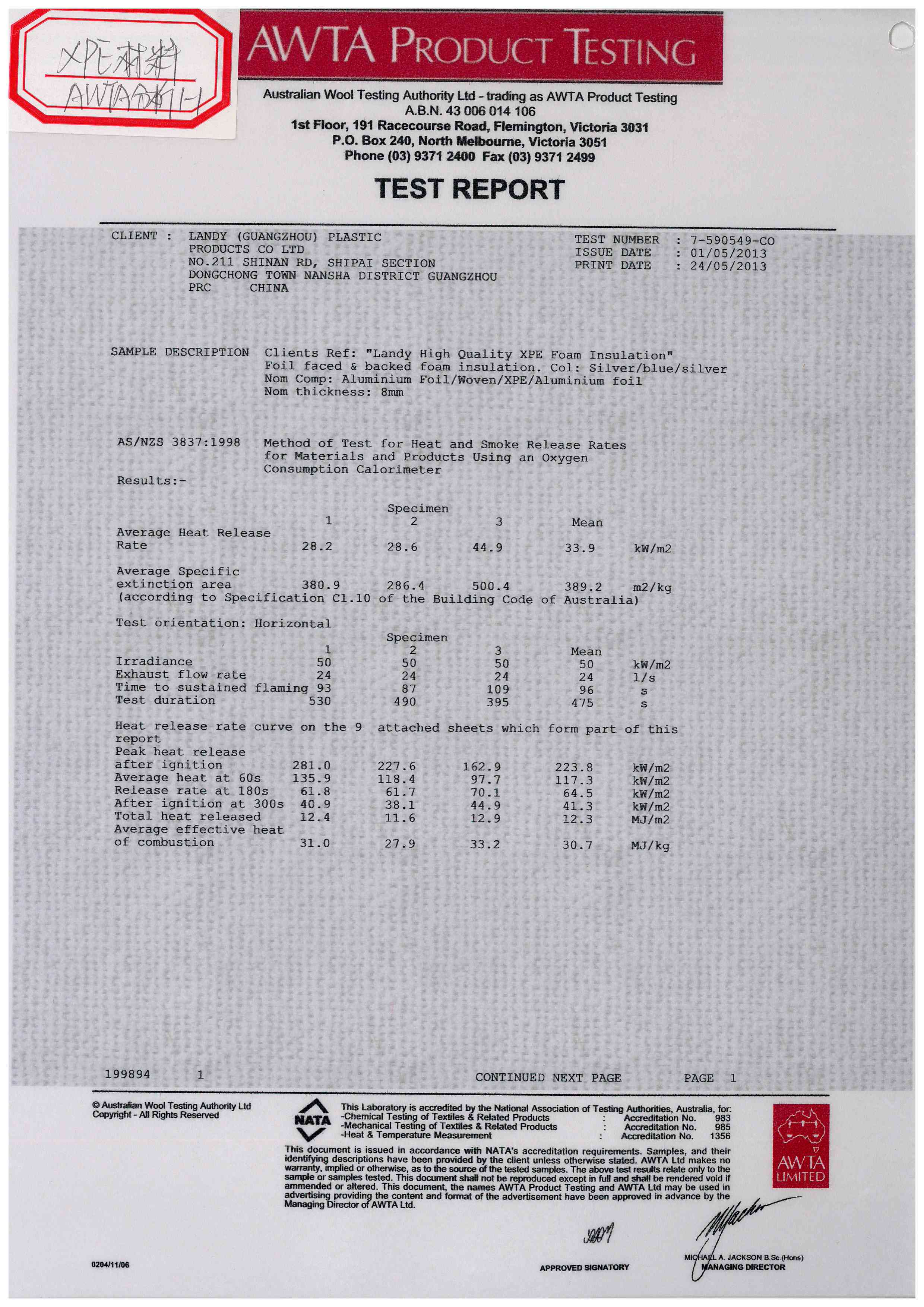 Недавно высококачественный продукт изоляции пены XPE Landy от Landy (Guangzhou) Plastic Co., Ltd. успешно прошел испытание на воспламеняемость материала AS 1530.2-1993 после строгого испытания Australian Wool Testing Authority Limited (AWTA), соответствующего авторитетным стандартам Австралии по противопожарным характеристикам.