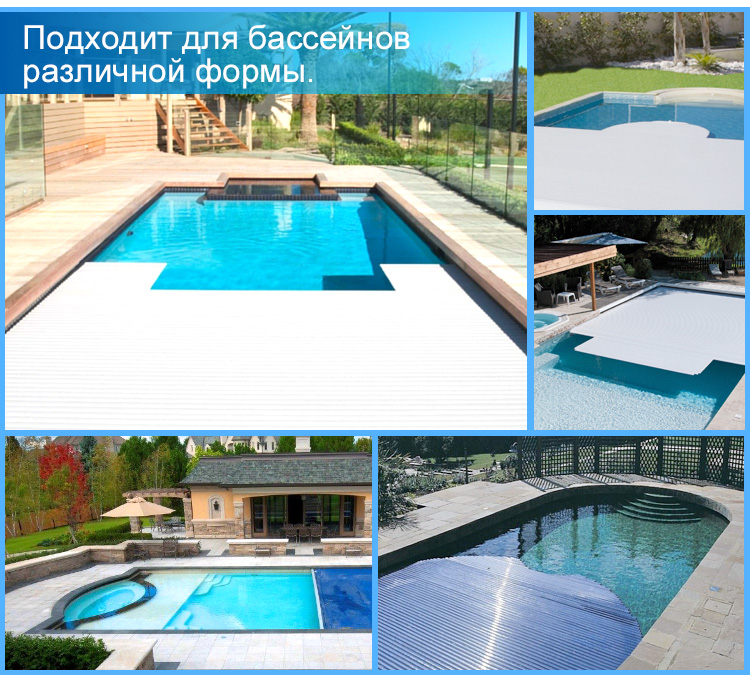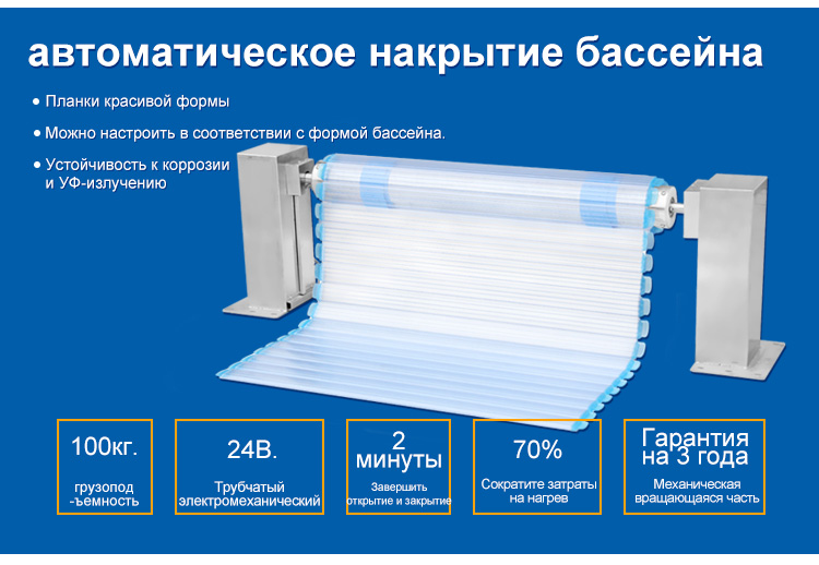 Энергосбережение, Сокращение испарения воды, Снижение затрат на осушение кондиционера; Изоляция, снижение затрат на нагрев около 70%; Уменьшить потребление химических веществ около 40%; Безопасный поплавок максимальная выносливость 100KG; поверхность поплавка противоскользящая выпуклая текстура, плавучая полоса хорошо герметична, не впускается в воду; удобна, удобна в установке, несколько способов установки являются факультативными; Беспроводное или проводное управление (расстояние беспроводного управления 50M); Автоматическое ограничение; Экономия пространства: 10M длинный диаметр после получения рулона составляет 55CM.