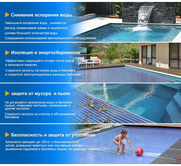 Он используется для покрытия поверхности бассейна, чтобы уменьшить испарение воды, поддерживать температуру воды, предотвращать попадание мусора и обеспечивать определенную безопасность для детей, а также в определенной степени блокировать ультрафиолетовое излучение, что помогает продлить срок службы материала для облицовки бассейна. Это интеллектуальное оборудование для покрытия бассейна, которое сочетает в себе защиту безопасности, поддержание качества воды, энергосбережение и снижение потребления, удобную работу, красивую чистоту и простоту обслуживания, чтобы повысить эффективность и комфорт использования бассейна.