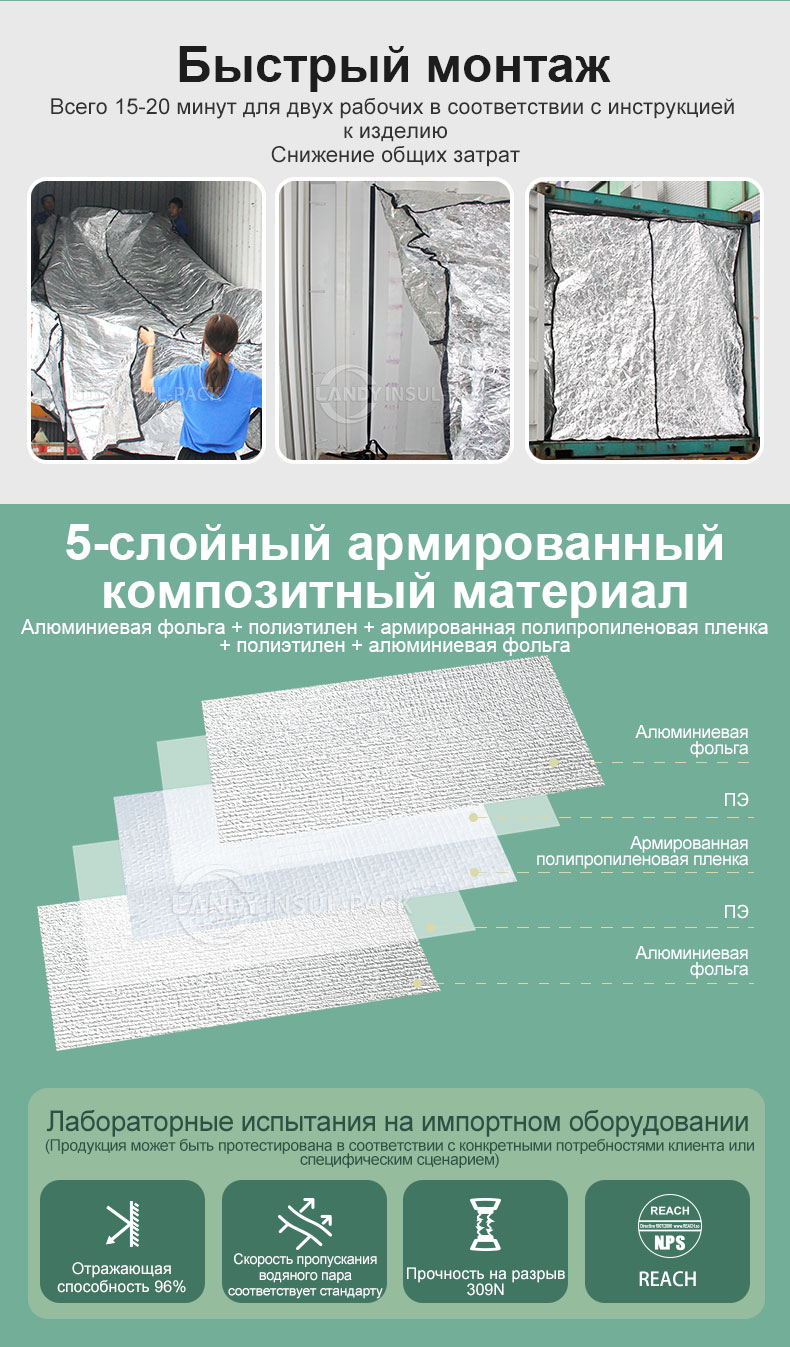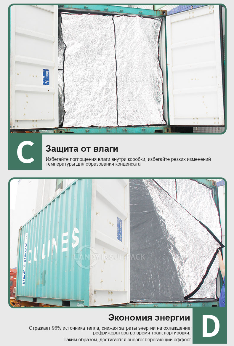 D. Энергосбережение: отражение 96% тепловых источников, снижение охлаждающей энергии в пути контейнерных перевозок и, следовательно, достижение энергосберегающего эффекта
