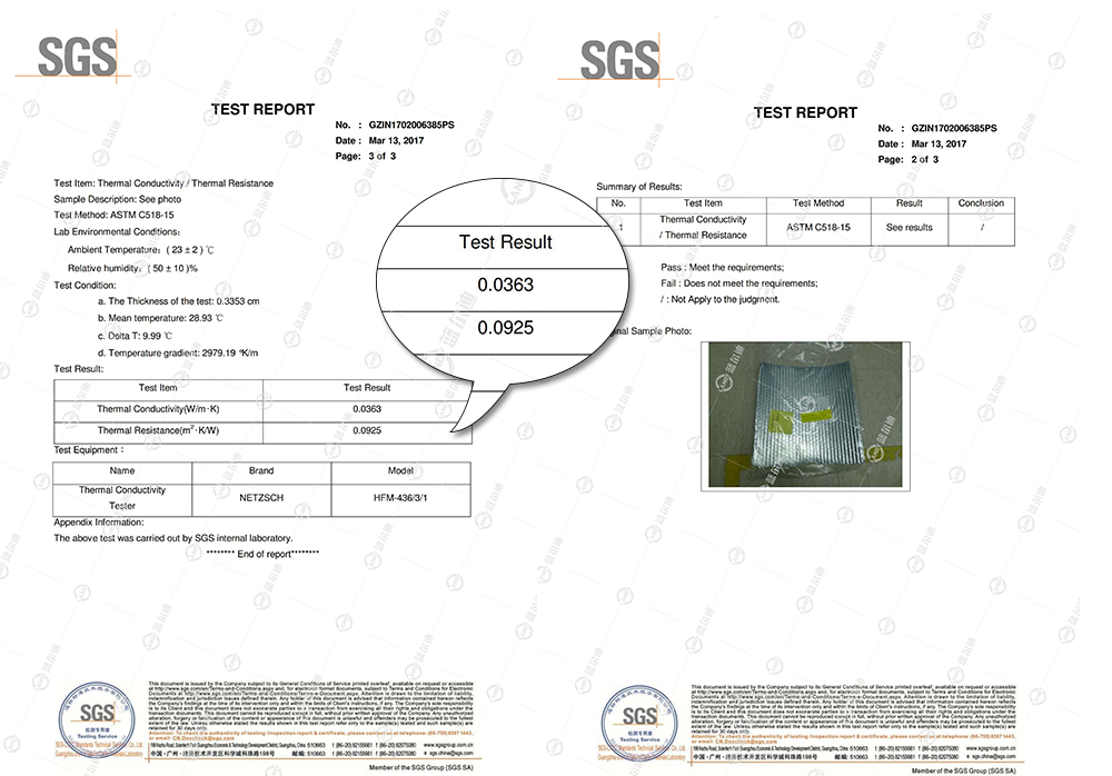 El material aislante de aluminio puro de burbuja única de Landy ha superado las rigurosas pruebas de esta norma bajo la inspección profesional de SGS. Durante las pruebas, el laboratorio simuló condiciones ambientales cercanas al uso real. La temperatura ambiente se controló a (23±2)°C y la humedad relativa se mantuvo en (50±10)%. Probar el material aislante en tales condiciones hace que los datos sean más fiables y prácticos. La conductividad térmica del material aislante de burbujas de aluminio puro es de sólo 0,0363 W/m-K, y el valor de resistencia térmica alcanza los 0,0925 m²-K/W. Esto significa que puede evitar eficazmente la transferencia de calor. En situaciones en las que se requiere aislamiento, como en edificios y equipos industriales, puede reducir significativamente la pérdida de calor y mejorar la eficiencia en el uso de la energía. Por ejemplo, en verano, puede impedir que el calor del exterior entre en la habitación, reduciendo el consumo de energía de los aparatos de aire acondicionado. En invierno, puede impedir que se escape el calor del interior de la habitación, manteniéndola caliente.
