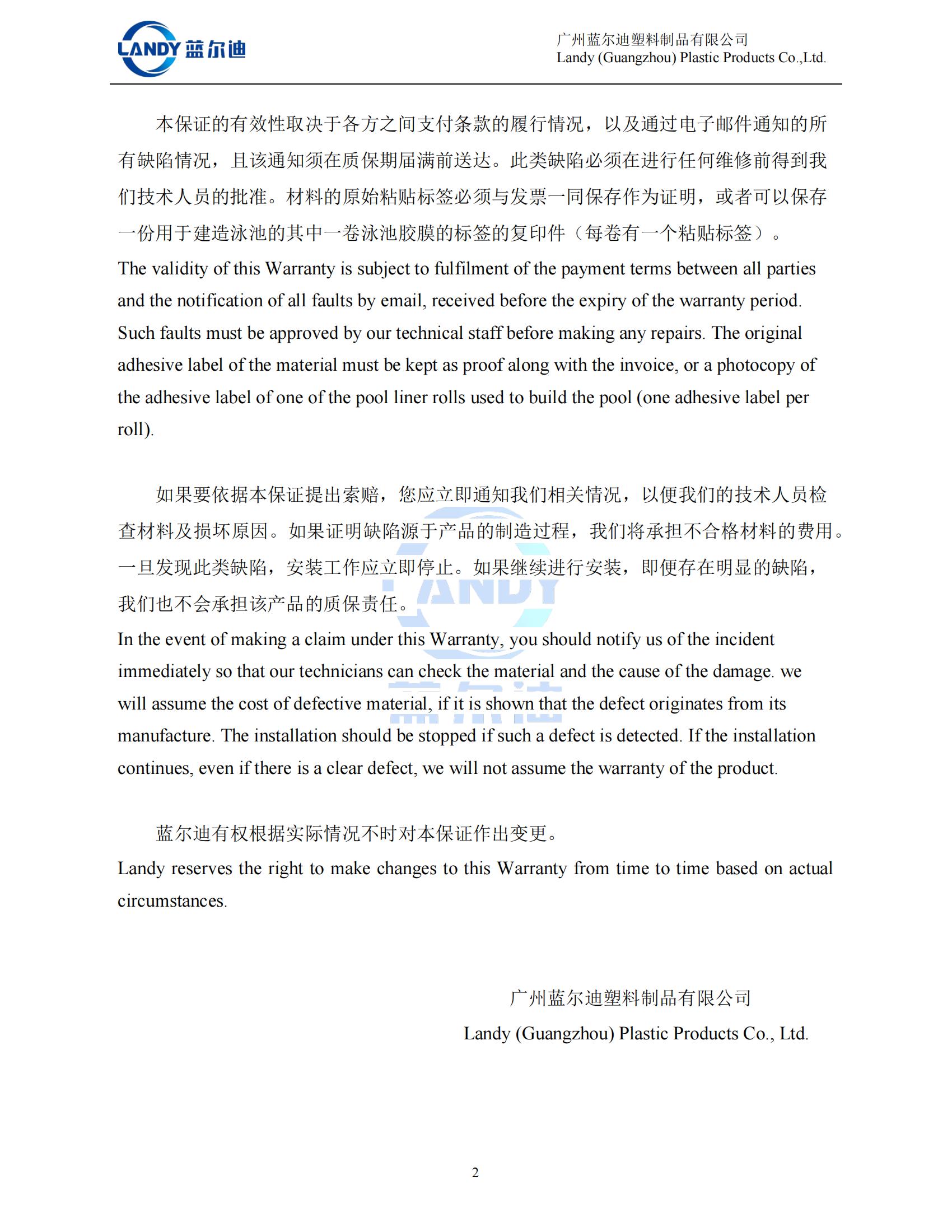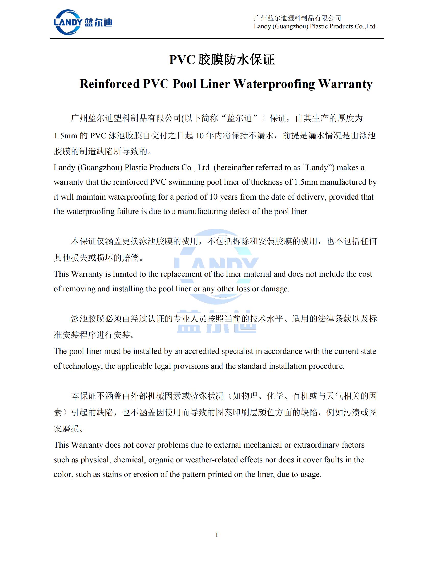 Acuerdo de garantía impermeable de membrana de piscina LANDY