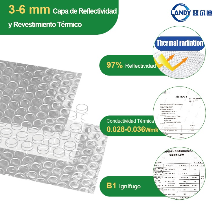 Aislamiento triple capa: Aluminio + burbujas de aire + aluminio (espesor 3-6 mm), refleja el 97% de la radiación térmica (conductividad 0,028–0,036 W/mK).