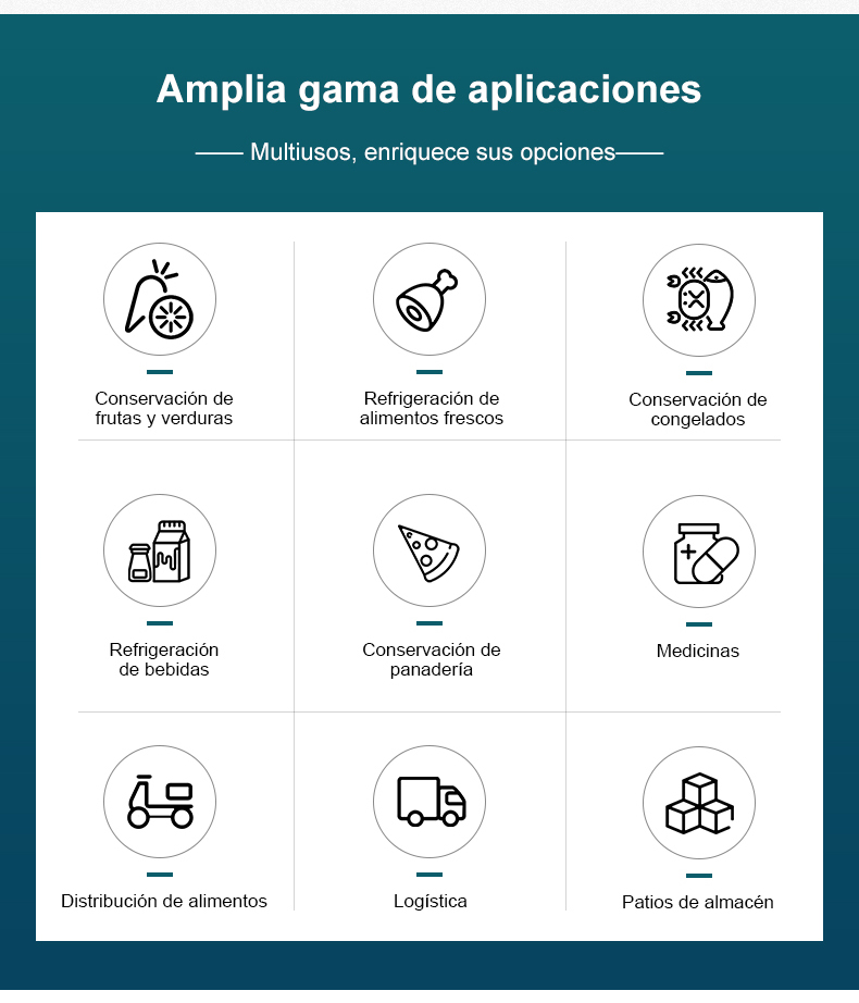 Uso: logística refrigerada, transporte marítimo y aéreo, carro de jaula, alimentos frescos, bebidas, licores, medicamentos, reactivos biológicos, productos químicos, plásticos, cosméticos, accesorios electrónicos, equipos militares, etc.