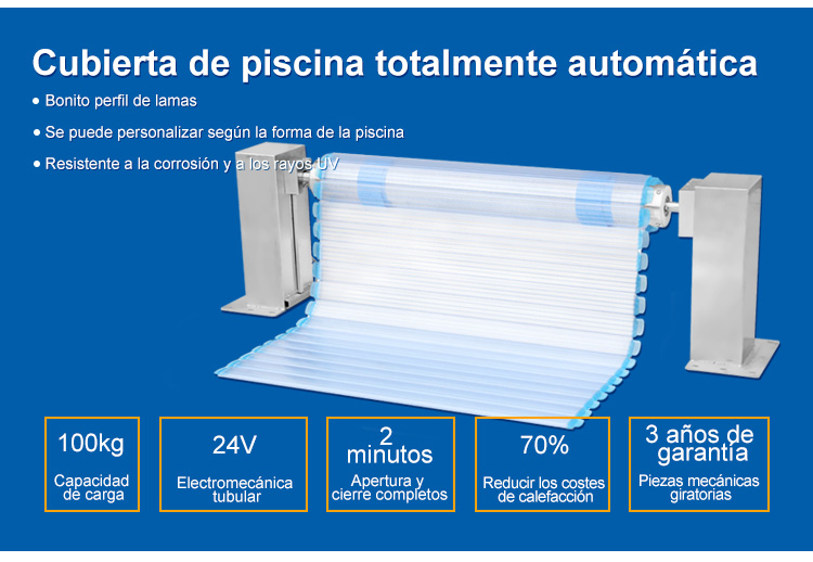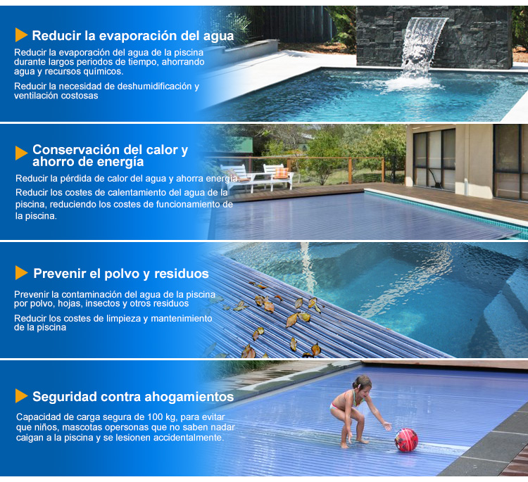 Se utiliza para cubrir la superficie de la piscina, para reducir la evaporación del agua, mantener la temperatura del agua, evitar la entrada de residuos y proporcionar cierta protección de seguridad para los niños, pero también puede bloquear la irradiación ultravioleta hasta cierto punto, lo que ayuda a prolongar la vida útil del material de revestimiento de la piscina. Es un equipo inteligente de la cubierta de la piscina que combina la protección de la seguridad, el mantenimiento de la calidad del agua, el ahorro de energía y la reducción del consumo, la operación conveniente, la belleza y el orden y el mantenimiento fácil. El objetivo es mejorar la eficacia y la comodidad del uso de la piscina.
